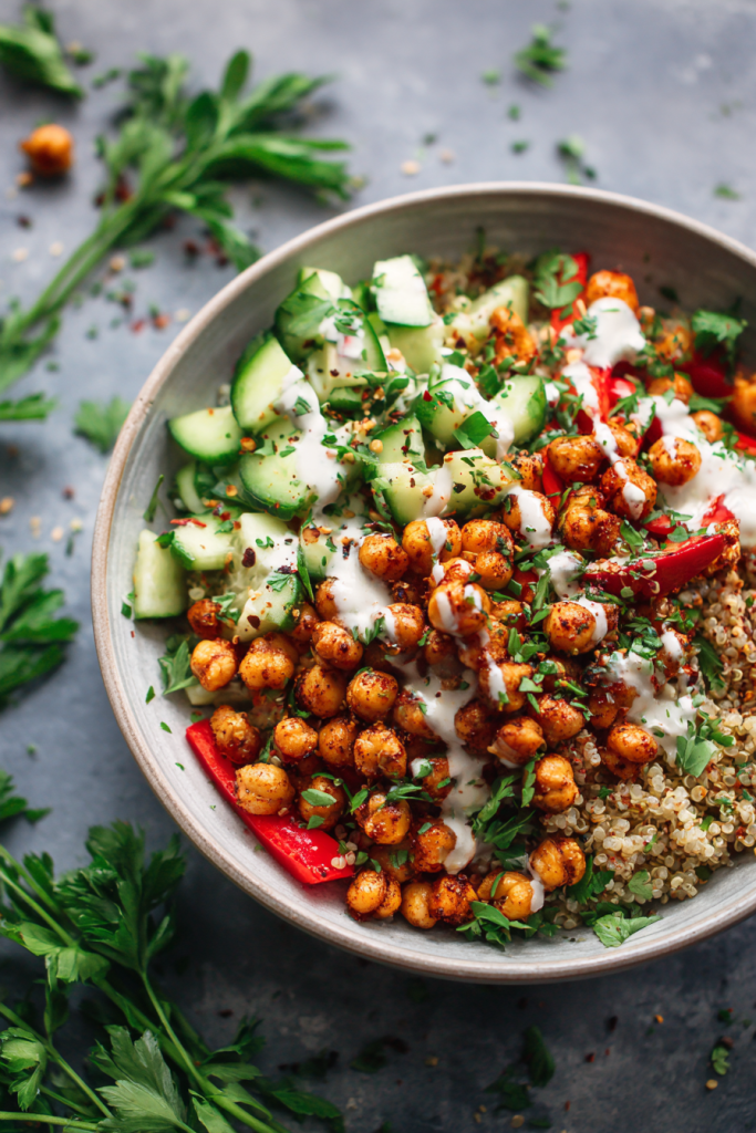 Roasted chickpeas tossed in harissa offer fiery crunch and plant-based protein. Fluffy couscous absorbs a cooling yogurt-lemon dressing. The contrast between heat and freshness keeps every bite interesting.