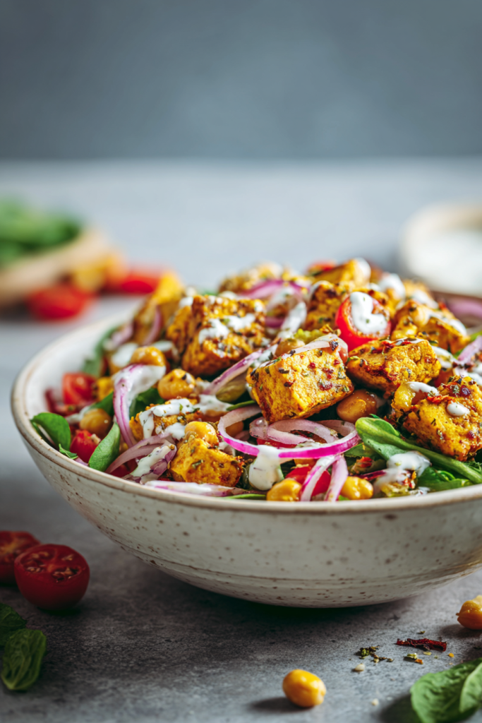 Marinated tofu supplies plant-based protein, while pumpkin seeds layer in even more. Creamy avocado adds healthy fats and silky texture. A simple lime vinaigrette keeps flavors clean and bright.