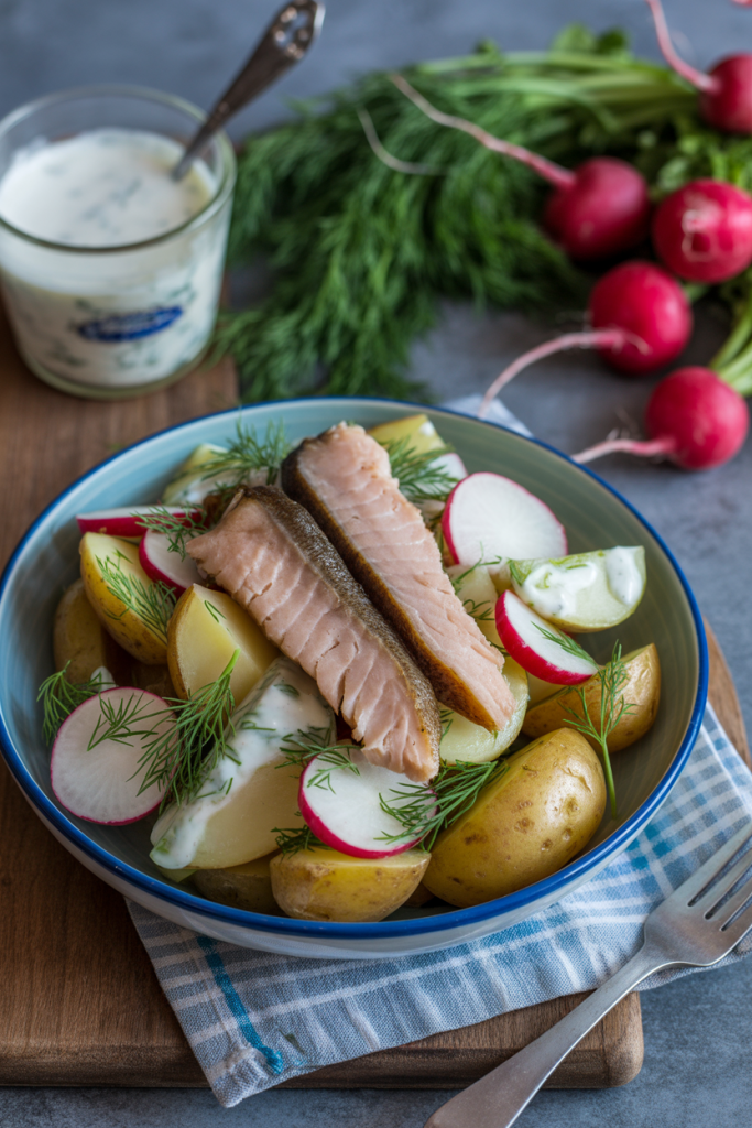 Smoked trout introduces delicate flavor and ample protein. Baby potatoes make the salad filling yet light when dressed with a tangy yogurt sauce. Fresh dill and radishes add springtime freshness.