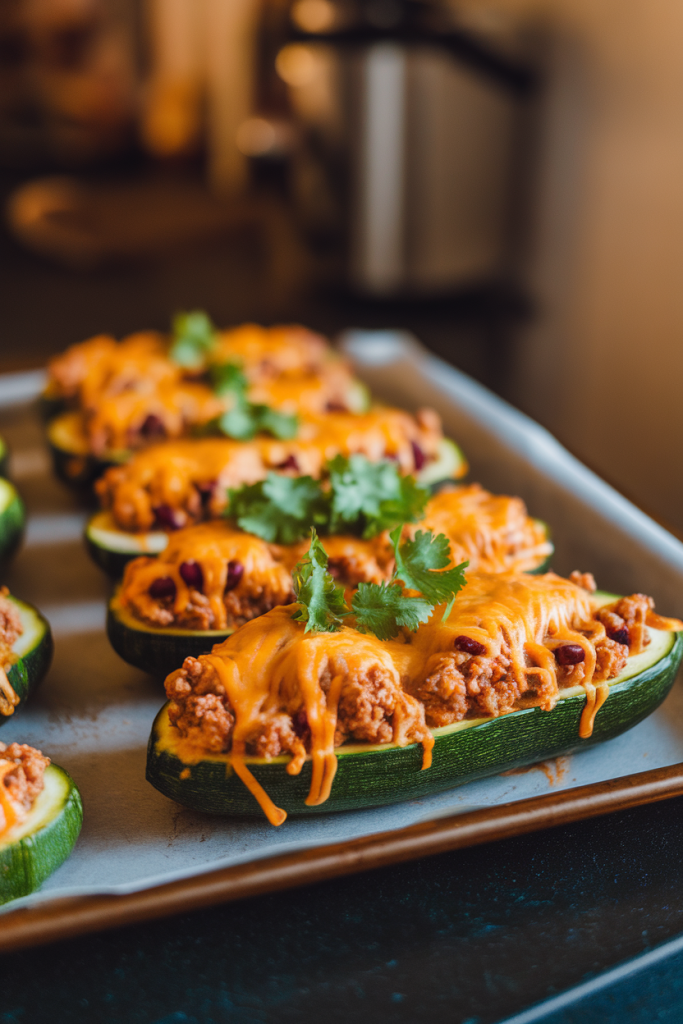 Scooped-out zucchini makes a built-in vessel that keeps carbs light while fiber remains high. Black beans pair with lean turkey for a balanced macro profile. Finish under the broiler for a bubbly cheese crust.