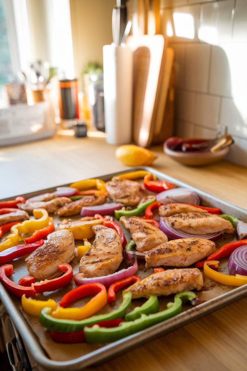 This is the gold-standard fajita most of us grew up loving. Thin chicken strips roast beside a trio of bell peppers and onions tossed in cumin, chili powder, and olive oil. A squeeze of lime at the very end brightens the dish and loosens the pan juices. Serve straight from the tray with warm flour tortillas.