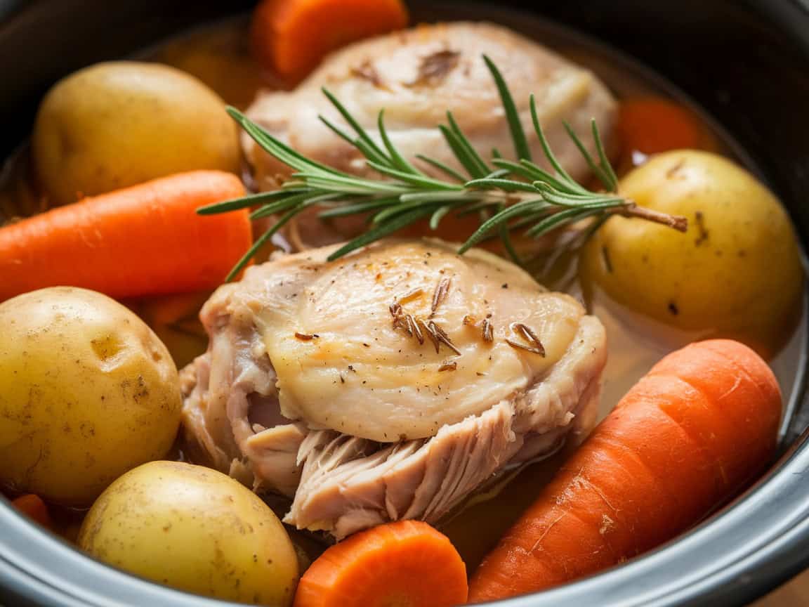 By the time you return home, a comforting aroma will greet you. Give the stew a quick taste and adjust the spices as needed. Then, ladle the chicken, vegetables, and broth into bowls. For an added touch, garnish with fresh rosemary or a sprinkle of black pepper.