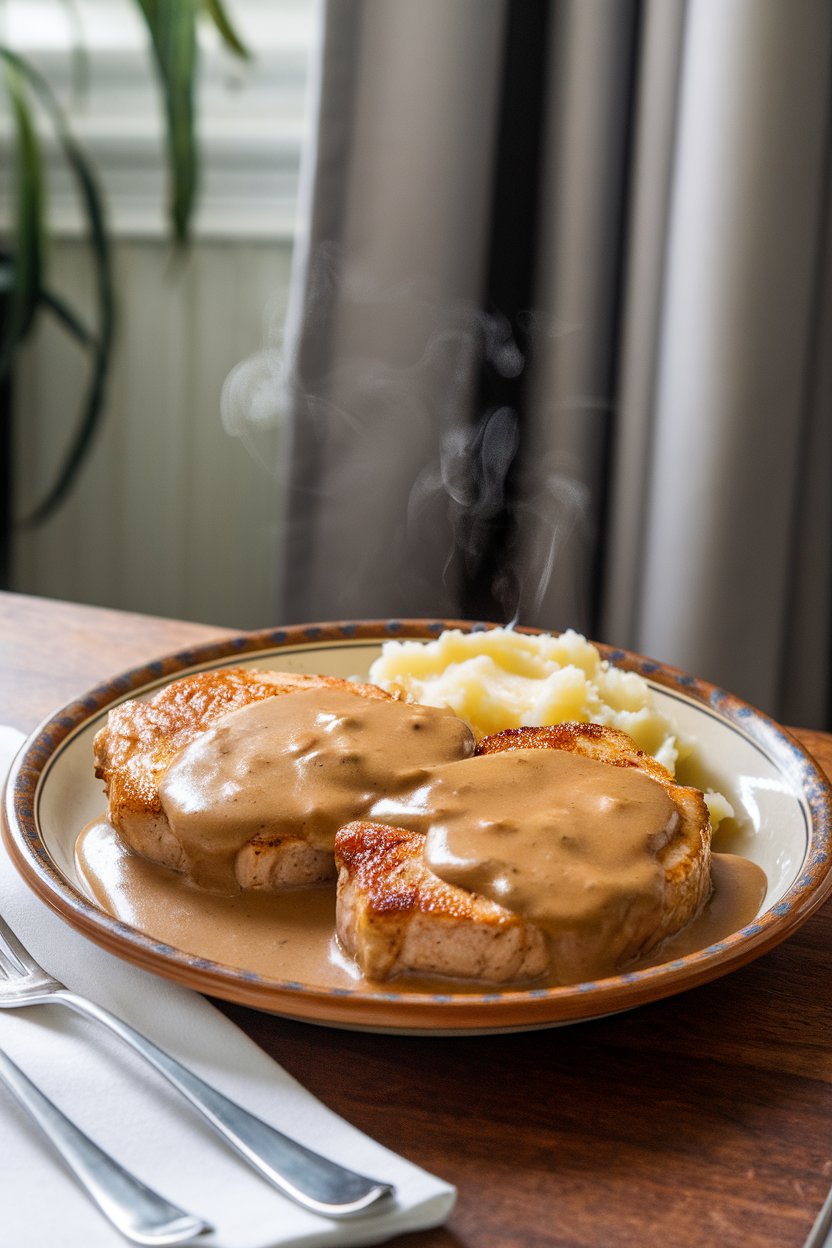 Butter, garlic, cream, and Parmesan bubble into a classic Alfredo. The chops poach gently, staying moist. Serve atop pasta for comfort in a bowl.