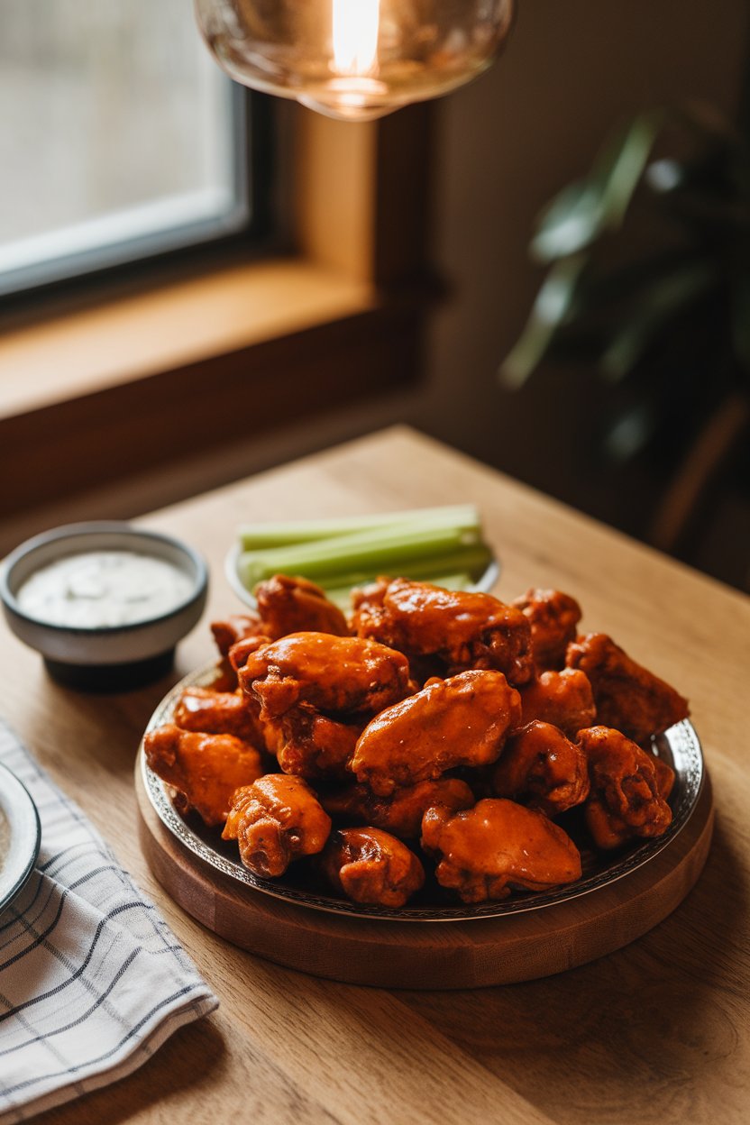 Frank’s-style hot sauce and melted butter create the unmistakable tang and heat fans expect. Bake or fry the wings until skin turns crisp, then toss them while they’re still sizzling so the sauce clings to every nook. A side of ranch or blue cheese cools things down. Keep plenty of napkins within reach—these disappear fast.