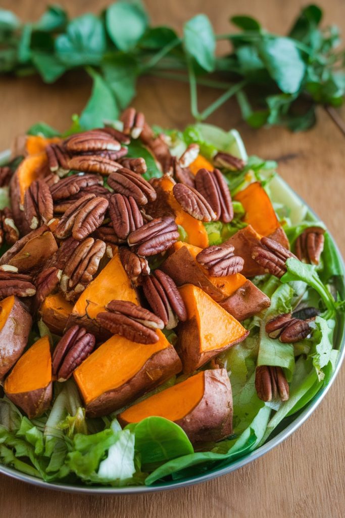 - Once the sweet potatoes have cooled, combine them with the pecans and mixed greens. Drizzle the vinaigrette over the salad and toss gently.