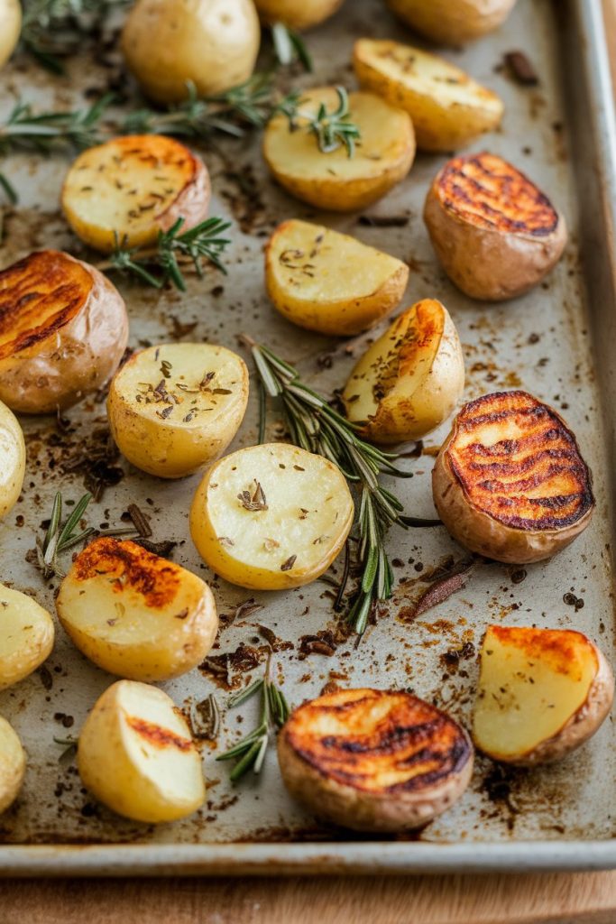 - In a mixing bowl, toss the potatoes with olive oil, garlic, rosemary, thyme, salt, and pepper.