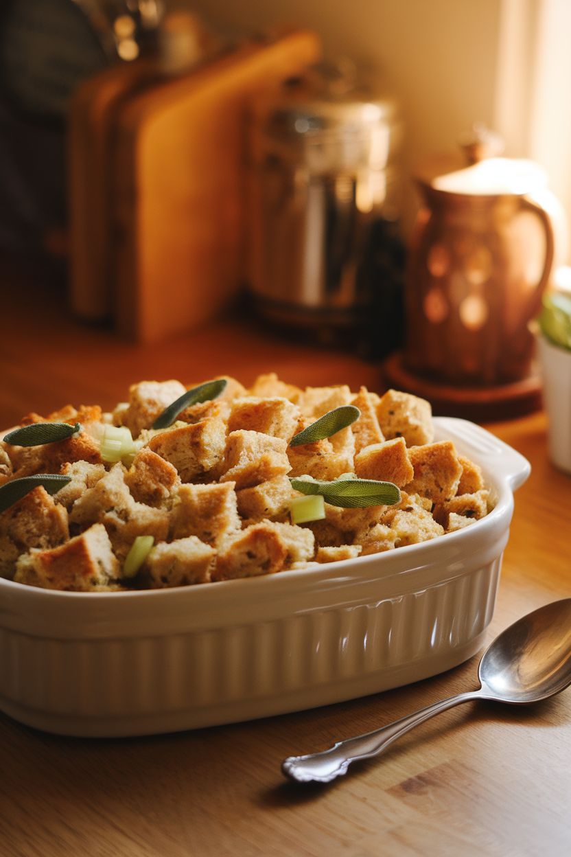 Toasted bread cubes soak up an herby broth, giving each bite a balance of soft center and crisp top. Fresh sage, sautéed onions, and a splash of butter lend a nostalgic aroma that signals the holiday season. Prepare the mixture a day ahead, then bake just before dinner so the house smells inviting when guests arrive.