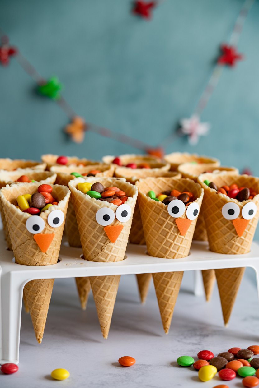 Fill waffle cones with raisins, pretzels, chocolate candies, and nuts, then wrap the bottom in plastic to keep everything inside. Stick candy eyes near the opening so the cone looks like a beak. It’s part snack, part edible toy.